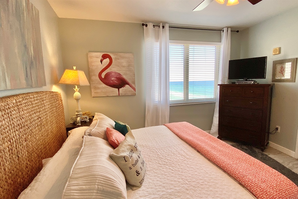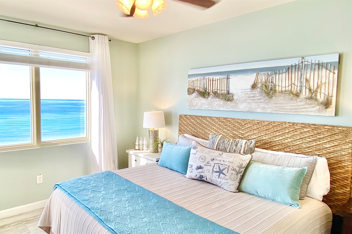 Oceanfront beautiful master bedroom has a KING bed, full bath, and tv/dvd player.